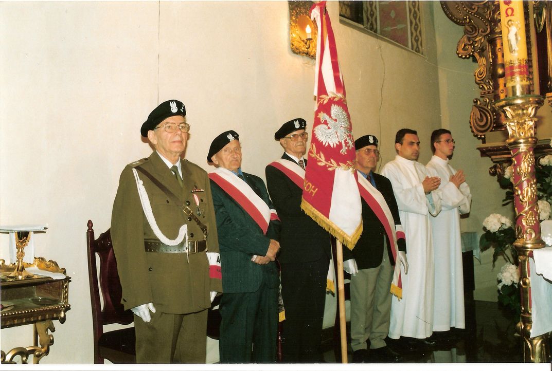 Sztandar Koła w czasie uroczystości Bożego Ciała 1992. W składzie pocztu od lewej: Bolesław Malinowski, Adam Grabias I Jarosław Wietlicki